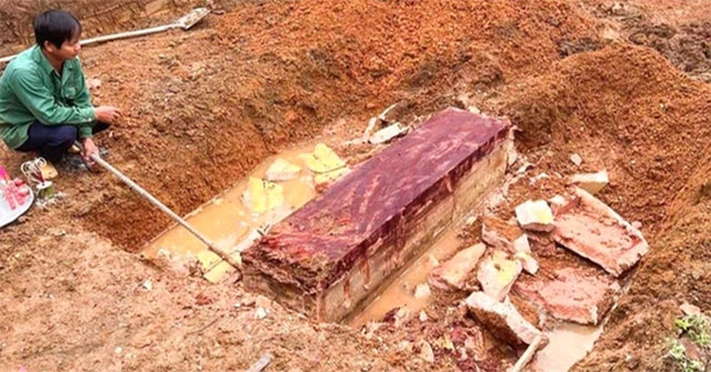 Sau khi người dân đập hết phần cứng giống đá lát nền khá dày bên ngoài, lộ ra một cỗ quan tài bằng gỗ màu đỏ thẫm. Cỗ quan tài gần như nguyên vẹn, rất nặng, phải huy động 6 người mới có thể khiêng lên. Người dân cho rằng đây là kiểu an táng “trong quan, ngoài quách” thời xưa.