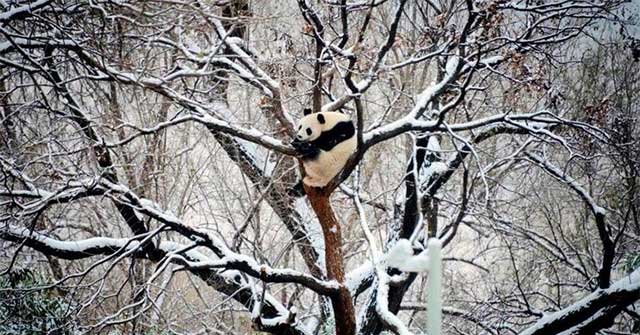 Một chú gấu trúc nằm nghỉ trên cây tại vườn thú sau trận tuyết rơi ở Bắc Kinh. (Ảnh: CNN)