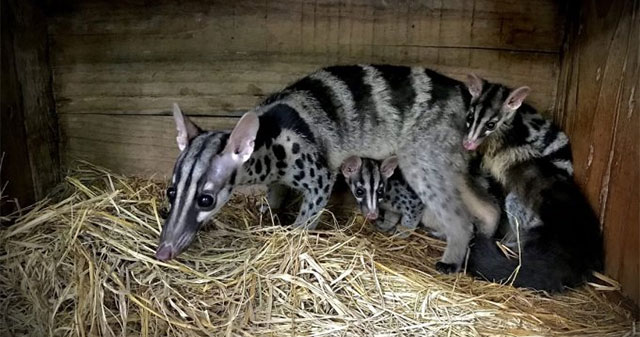 10 cá thể cầy vằn quý hiếm vừa được sinh sản tự nhiên tại Trung tâm bảo tồn động vật hoang dã ở Vườn quốc gia Cúc Phương.