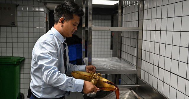 Nhân viên nhà hàng ở Thành Đô đổ nồi nước lẩu lẫn dầu xuống phễu lọc để tái chế. (Ảnh: AFP).