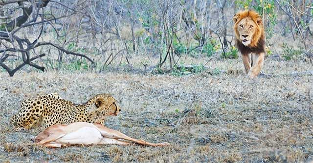 Sư tử tiến tới, chuẩn bị cướp mồi của báo săn.