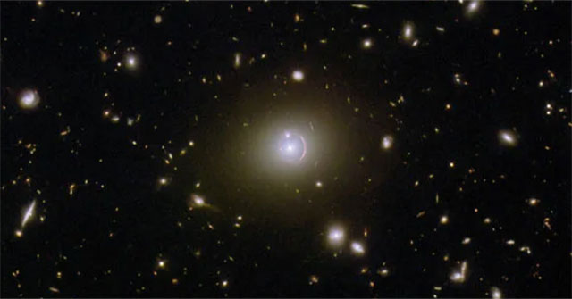 Trong bức hình của Hubble, ánh sáng từ vật thể này bị biến dạng thành hình lưỡi liềm, tạo thành một chiếc “vòng Einstein“ hiếm gặp giữa trời.