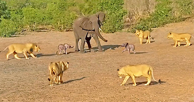 Đàn sư tử hợp lại, bao vây voi mẹ và con non.