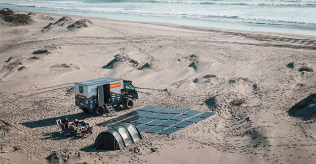 Nhóm Peak Evolution sử dụng kết hợp pin mặt trời trên nóc xe và dưới mặt đất để duy trì hoạt động cho xe tải điện. (Ảnh: Gebrüder Weiss/Anna Pocinska).